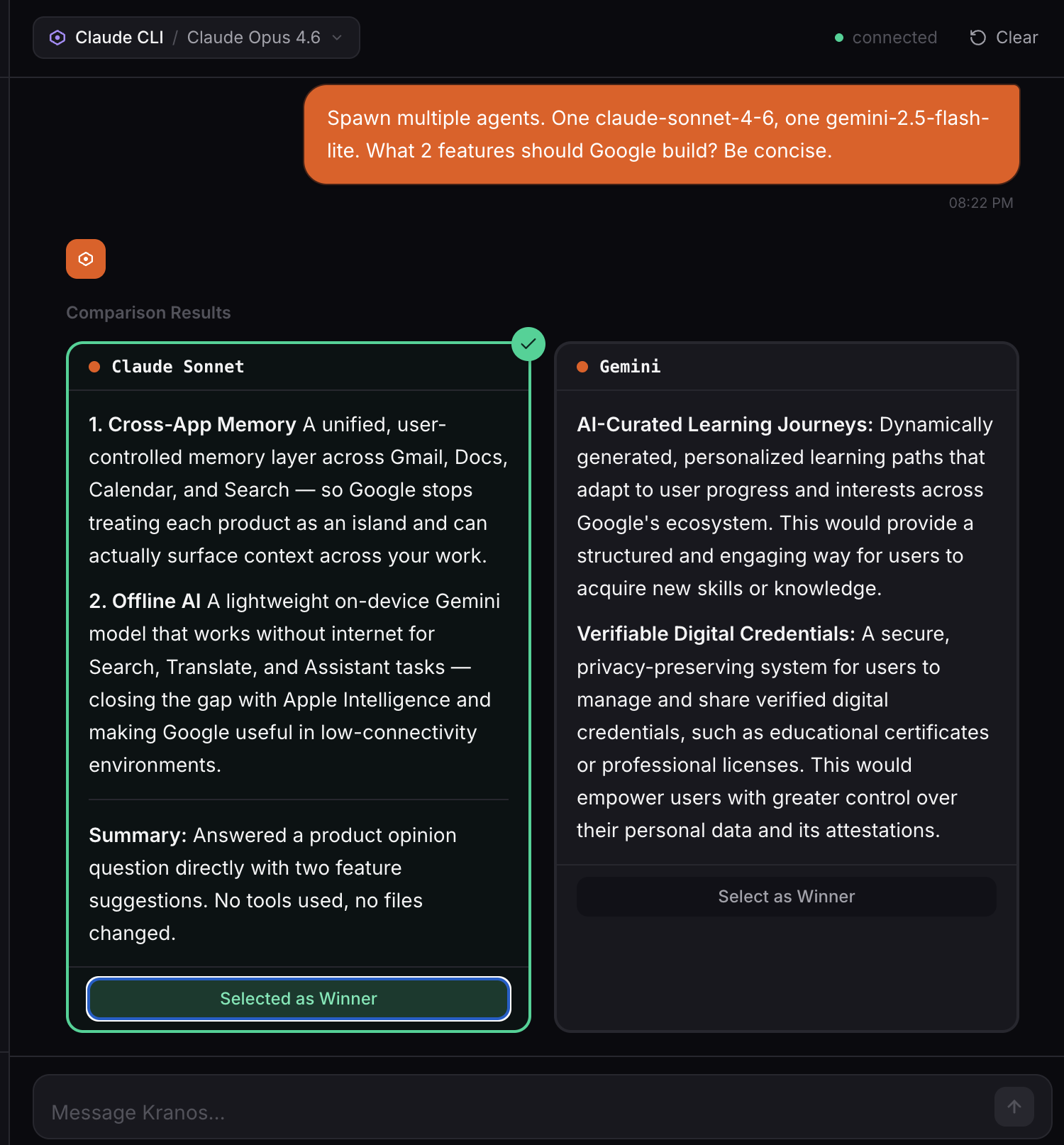 Kranos orchestrates long-running multi-model agents to autonomously complete tasks.